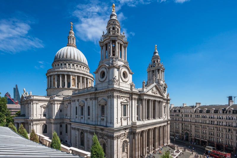 Колоссальное здание собора, построенное Кристофером Реном, стоит на холме и до недавнего времени являлось самым высоким сооружением в Лондоне — его высота составляет 111 м. Собор не теряется даже среди современной многоэтажной городской застройки. Можно представить, какое впечатление он производил в те годы, когда самое высокое здание Лондона не превышало четырех этажей!