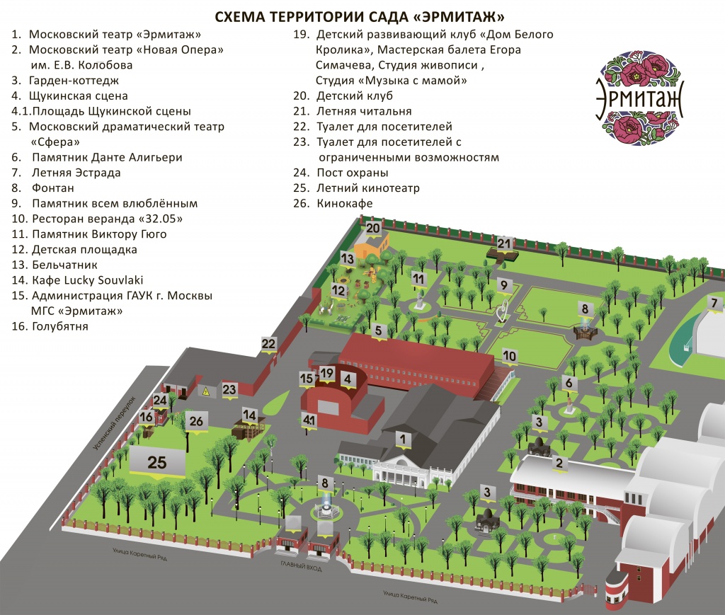 В 1898 году в здании театра "Эрмитаж" состоялось официальное открытие Художественного театра под руководством Станиславского и Немировича-Данченко. И в наше время сад замечателен тем, что здесь расположены театры "Новая опера", "Эрмитаж" и летняя эстрада, где проходят музыкальные фестивали. Адрес: Ул. Каретный Ряд, 3