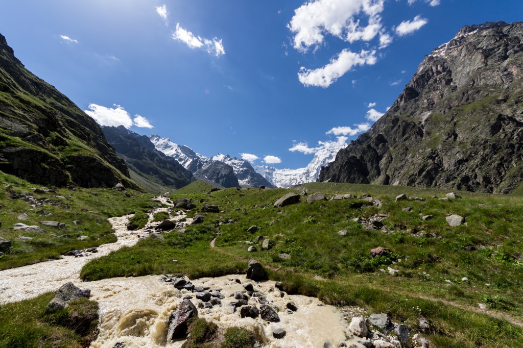 Природа здесь по-настоящему дикая и величественная. Узкие горные тропы петляют среди скал, переходят в пастбища, альпийские луга и ледниковые поля. В июле склоны расцветают буйством горных цветов, а к августу и сентябрю ущелье угощает путников лесной ягодой. Особое очарование придают водопады, ледники, горные озера и прозрачный воздух, в котором всё кажется ближе и ярче.